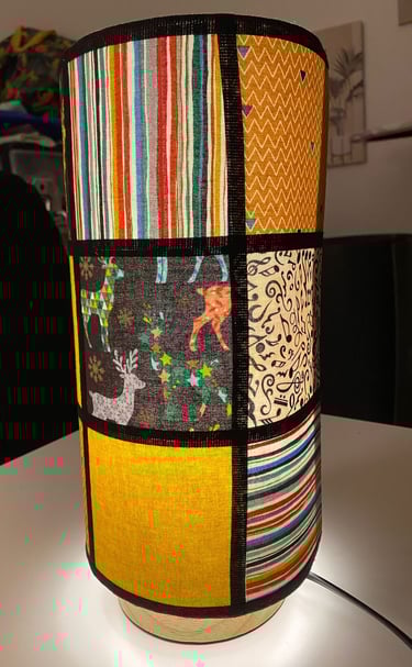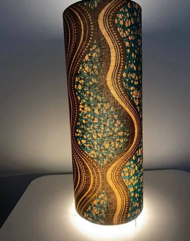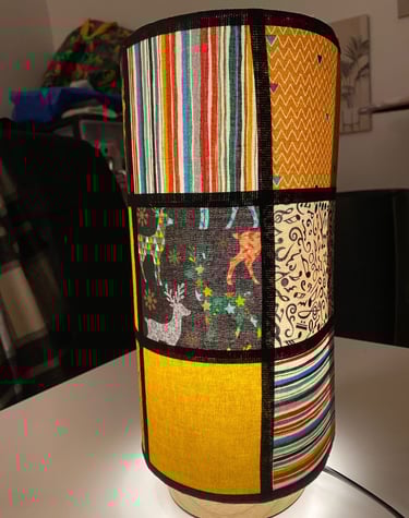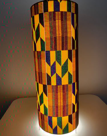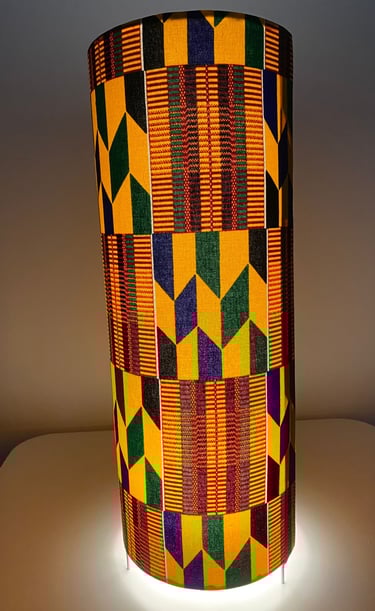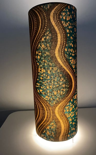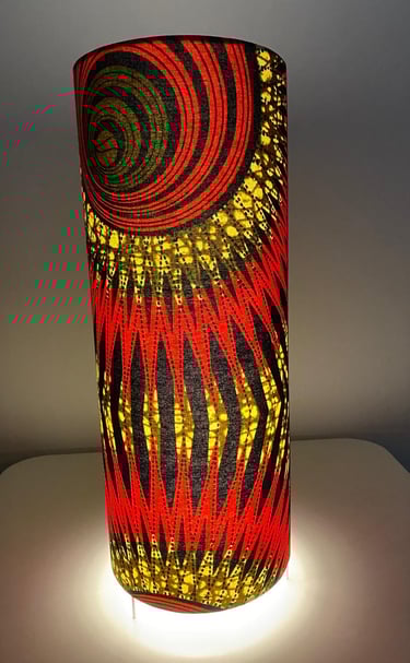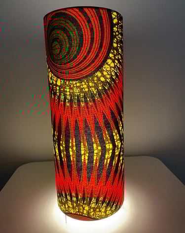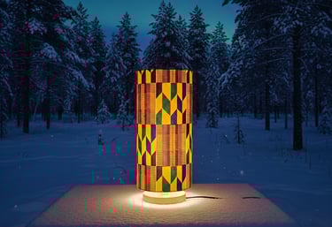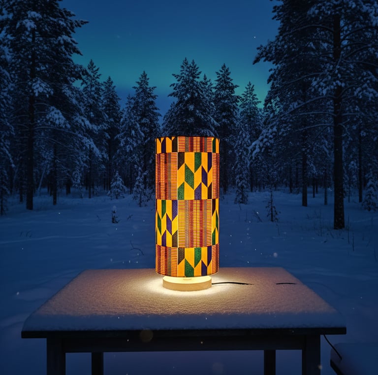 Lumières qui racontent un voyage entre l'Afrique et la Finlande, mêlant tissus exotiques et bois noble.